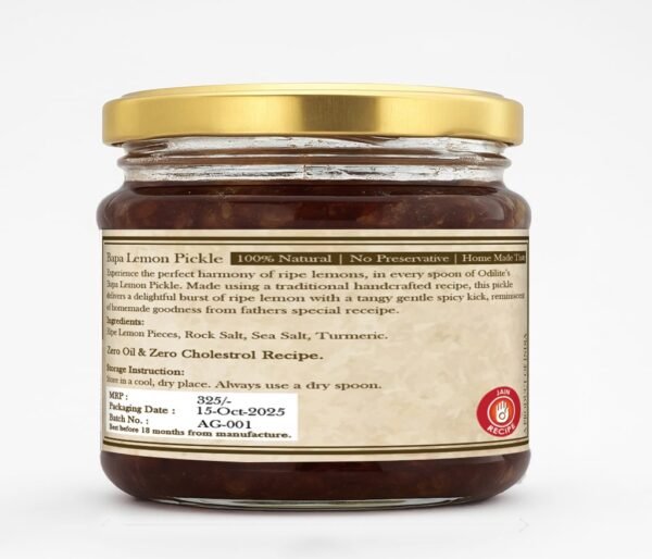 Experience the perfect harmony of ripe lemon, in every spoon of ODILITE Bapa Lemon Pickle. Made using a traditional handcrafted recipe, the pickle delivers a delightful burst of ripe lemon with a tangy gentle spicy kick, reminiscent of homemade goodness from Father Special recipe.