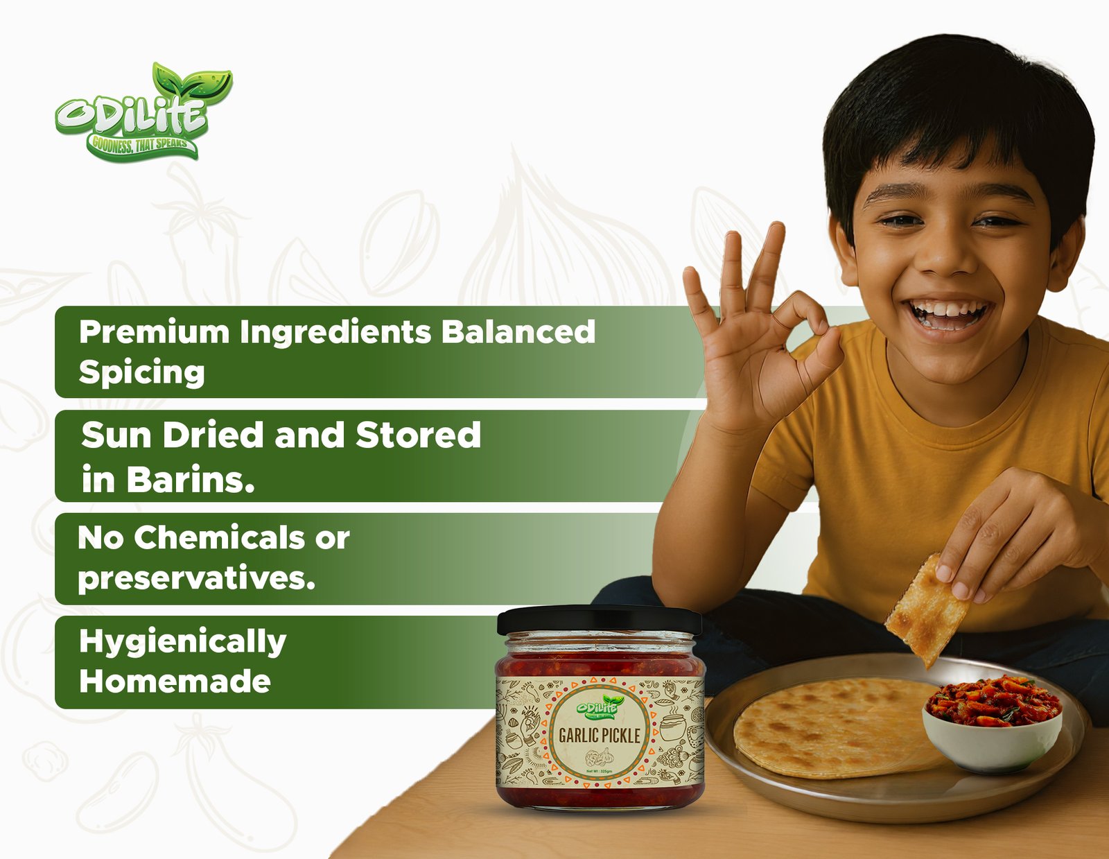 Indulge in the bold and authentic taste of our Premium Garlic Pickle a handcrafted delicacy made from select peeled garlic cloves, sun-ripened spices, and rich tamarind pulp. Every bite delivers a perfect blend of spicy, tangy, and savory notes, elevated with cold-pressed mustard oil and traditional Indian seasoning.